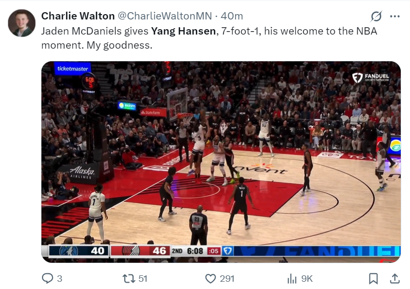 然而,比赛第二节,麦克丹尼尔斯给杨瀚森上了一课。他直接弯弓搭箭,隔扣了身高7尺1(2.16米)的杨瀚森,这一幕让杨瀚森有些蒙圈,也成为了比赛的一个焦点。
