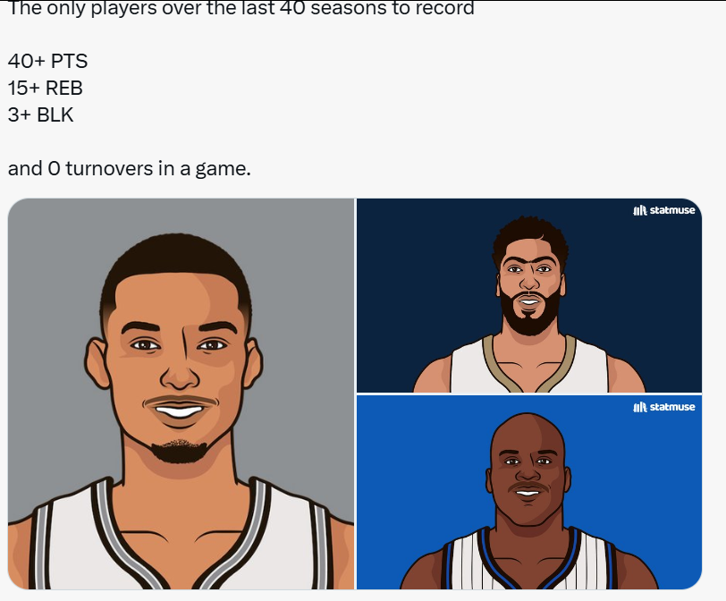 文班亚马此役的表现堪称历史级,他成为NBA历史上第三位在单场比赛中砍下至少40分15篮板3盖帽且0失误的球员。此前仅有浓眉哥和奥尼尔达成过这一壮举。这一数据不仅体现了他在进攻端的统治力,更展现了其作为内线球员的防守威慑力。