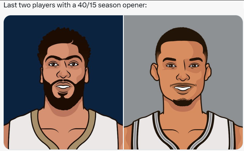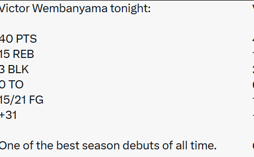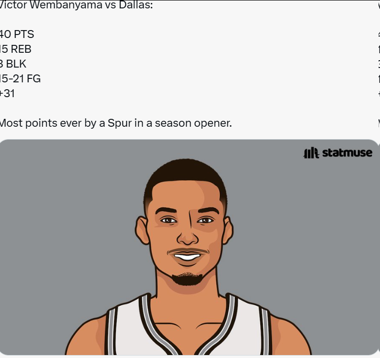 作为马刺队的新秀,文班亚马在揭幕战中便创造了多项队史纪录。他成为马刺队史首位在揭幕战中砍下40分的球员,同时也是队史第二位在揭幕战中至少得到30分10篮板的球员(上一位是2004年的邓肯)。此外,他还成为NBA历史上第六位在赛季首战中砍下至少40分15篮板的球员,前五位分别是张伯伦、卡尔-马龙、浓眉、沃尔特-贝拉米和埃尔金-贝勒。