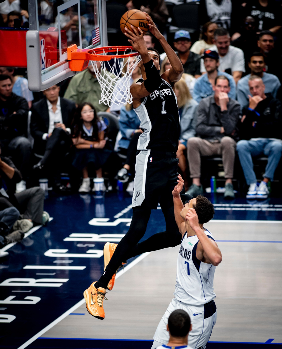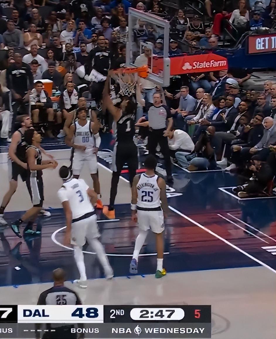 文班亚马的统治力从比赛一开始便显露无遗。面对独行侠球员华盛顿的防守,他一步过掉对手后直接完成拉杆抡臂大风车反扣。这一动作对于一名身高2.24米(7尺4寸)的内线球员而言,几乎是不可能完成的任务。更令人惊叹的是,他轻松越过身高2.01米的锋线华盛顿,展现了恐怖的身体天赋。相比之下,弗拉格只能目睹这一切,显得力不从心。