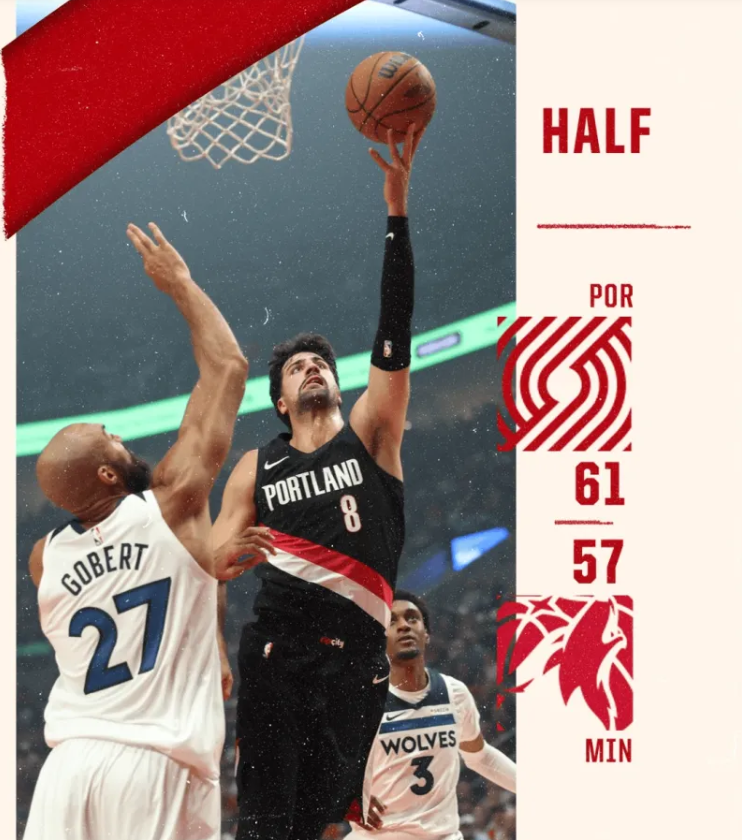 次节回来,杨瀚森重新上场,顺下接球上篮造成兰德尔犯规,两罚全中拿下NBA生涯首分。接着篮下持球强攻,反遭戈贝尔大帽扇飞,随后又被麦丹残暴隔扣。接着卡位漏掉戈贝尔丢掉篮板被后者造成犯规,被上课后随之替换下场。格兰特底角三分连续命中,篮下强攻再打进,替补出场6投5中已经砍下全队最高的12分,开拓者领先到6分。麦丹接球三分命中后,接着再助攻里德跳投得手,森林狼一波5-0将分差缩小至1分。格兰特单打里德极限命中还有加罚,半场战罢,开拓者以61-57依旧领先森林狼4分。