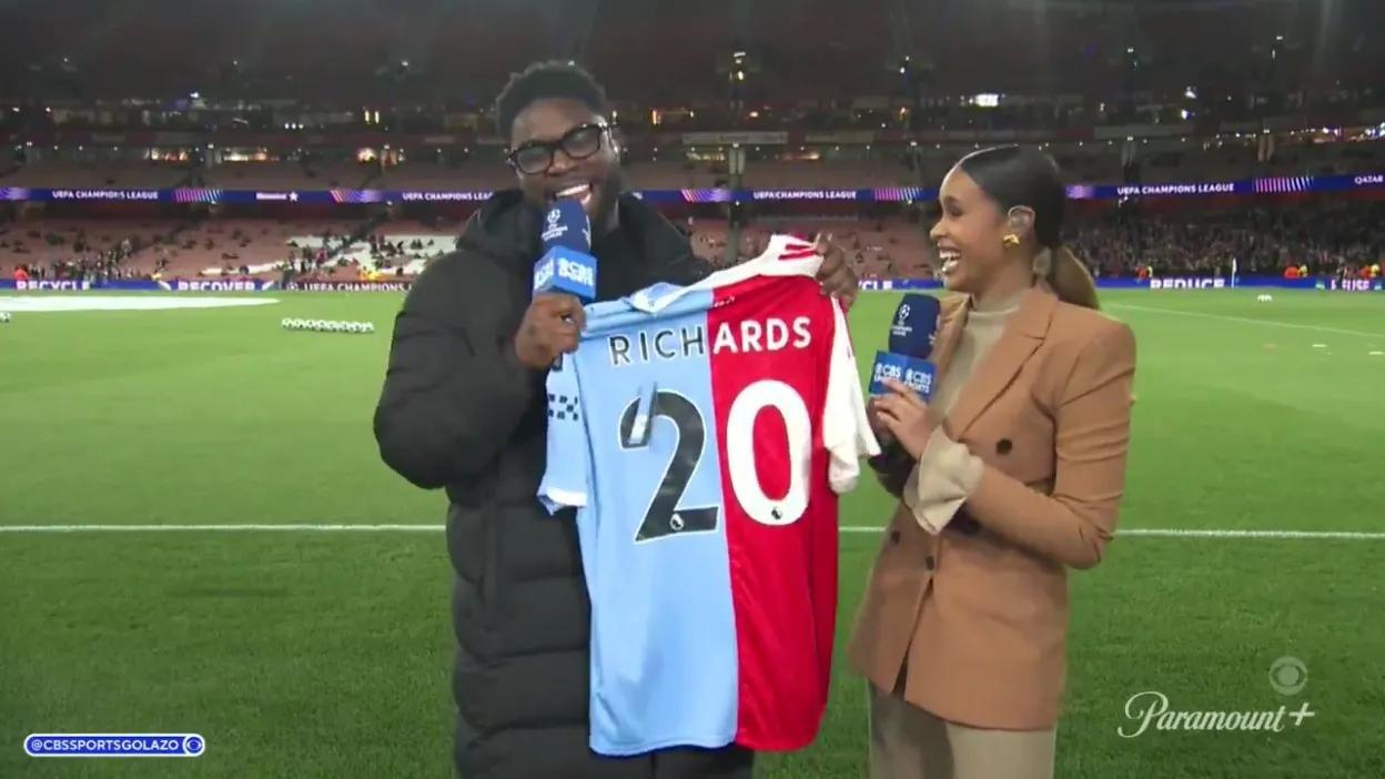 在最近的一档节目直播中,曾透露自己私下也支持阿森纳的曼城旧将理查兹,意外收到了一件别具一格的礼物——一件阿森纳与曼城的缝合球衣。