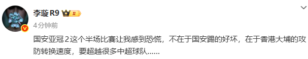 赛后,多位媒体人在社交媒体上发文,对国安的落后局面进行了深入剖析。其中,知名媒体人李璇的观点尤为引人注目。她直言不讳地表示:“国安在亚冠二级联赛的这个半场比赛,让我感到了一种恐慌。这种恐慌并非源于国安踢得如何,而在于香港大埔队所展现出的攻防转换速度,竟然要超越很多中超球队。”