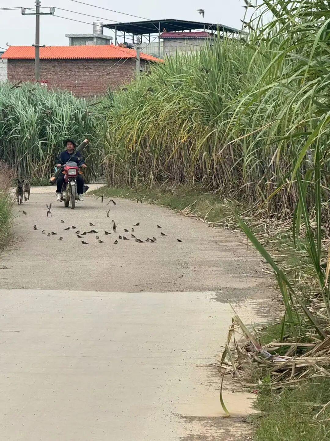 在事件引发的沉重思考外,作者记录了一段荒野中的独特体验:昨晚九点,他停车于群山环绕的水库边,借外用电源照明读书。潮气与风声中,心灵获得前所未有的宁静。次日清晨下山时,村落前的小路上,摩托、狗、觅食的鸟群与甘蔗林构成一幅和谐画面。