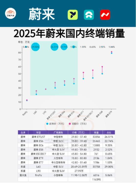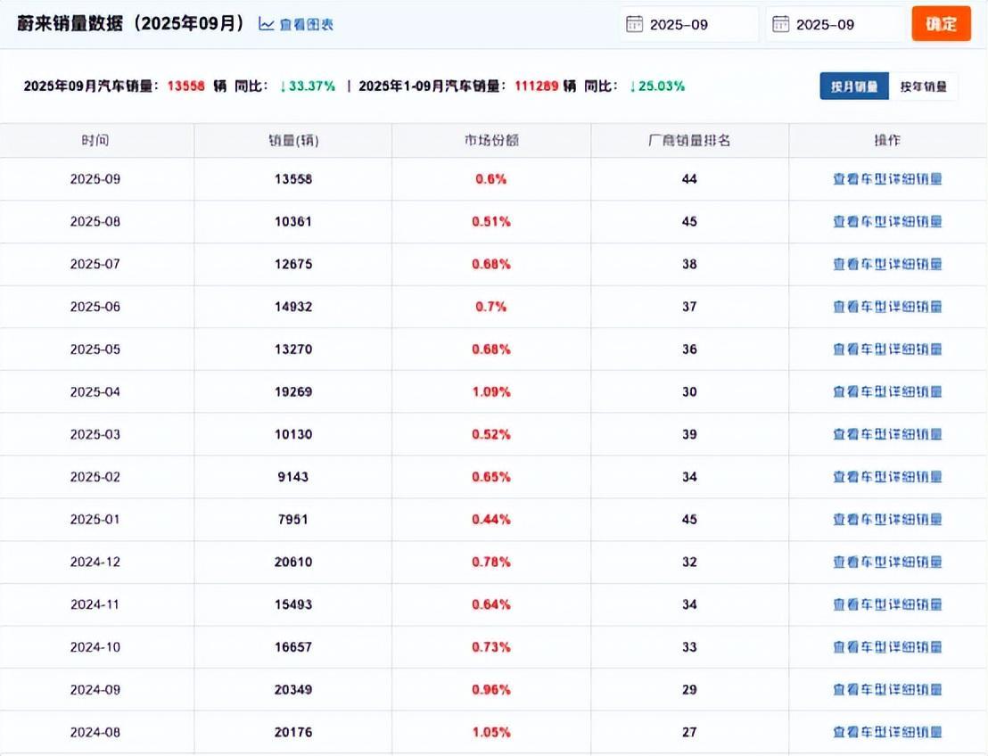 2025年9月,蔚来公司公布新车交付数据,当月交付新车35500台,同比增长68%,创下历史新高。然而,仔细剖析交付结构,就会发现其中隐藏的问题。在这35500台新车中,蔚来品牌交付了14000台,乐道品牌交付了15500台,firefly萤火虫品牌交付了6000台,乐道和萤火虫这两个新品牌的交付量已经超过了主品牌蔚来。这意味着蔚来正在通过多品牌战略扩大市场份额,但主品牌在高端市场的定位却面临着巨大压力。对比其他竞争对手,小鹏汽车9月交付新车42000辆,理想汽车交付34500辆,曾经的“蔚小理”三兄弟,如今的座次已发生显著变化,蔚来主品牌的单月交付量已落后于小鹏和理想。