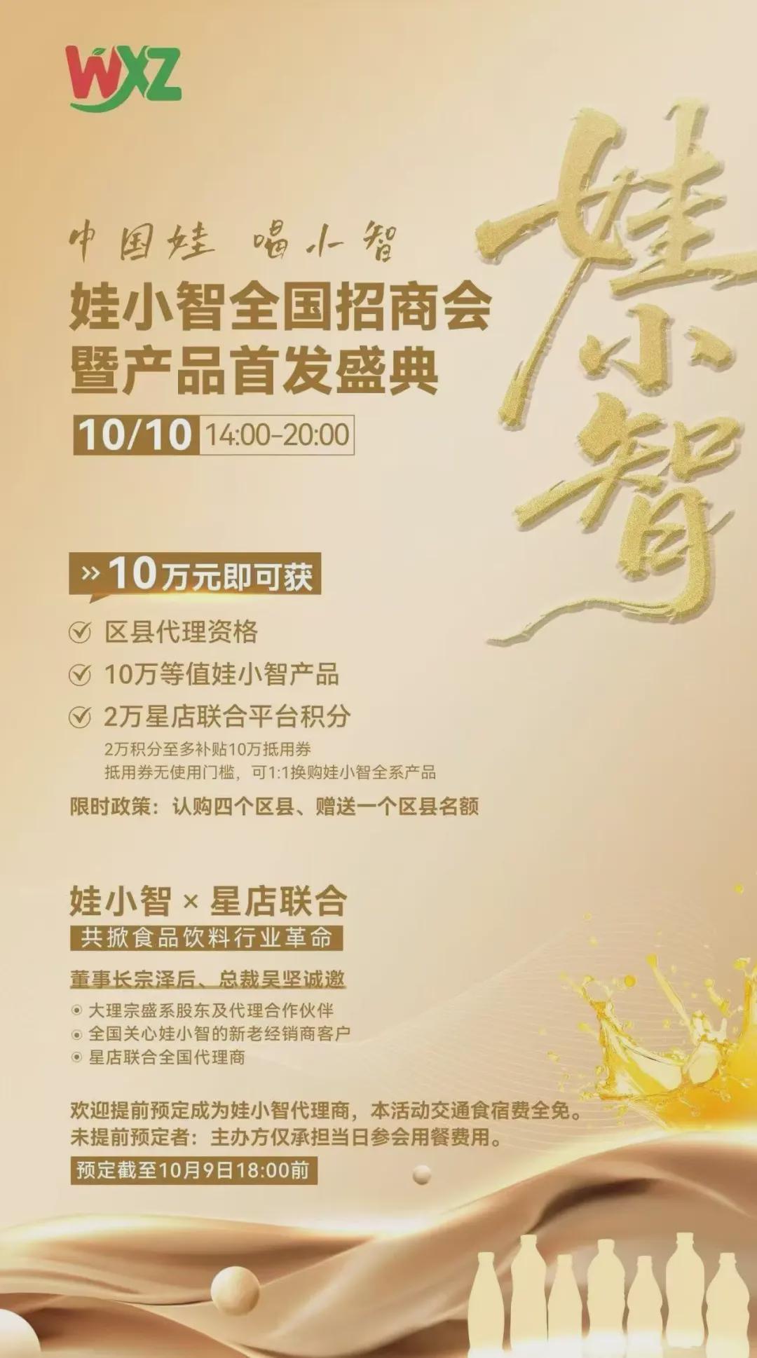 值得注意的是,宗馥莉的叔叔宗泽后也推出了自己的品牌“娃小智”,并开启了招商活动。据蓝鲸新闻获取的“娃小智”招商海报显示,10月10日“娃小智”在杭州举行了全国招商会,购买“娃小智”产品10万元以上即可获得该区域独家经销商资格。