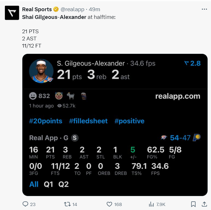 全场比赛,亚历山大出战35分钟,31投15中,三分5中2,罚球26中23,狂砍55分8篮板5助攻2抢断1盖帽。这一数据不仅刷新个人生涯得分纪录,更成为NBA新赛季首个50+得主。同时,这是他在雷霆生涯第五次砍下50+,追平拉塞尔·威斯布鲁克保持的队史纪录,进一步巩固其“雷霆新王”的地位。