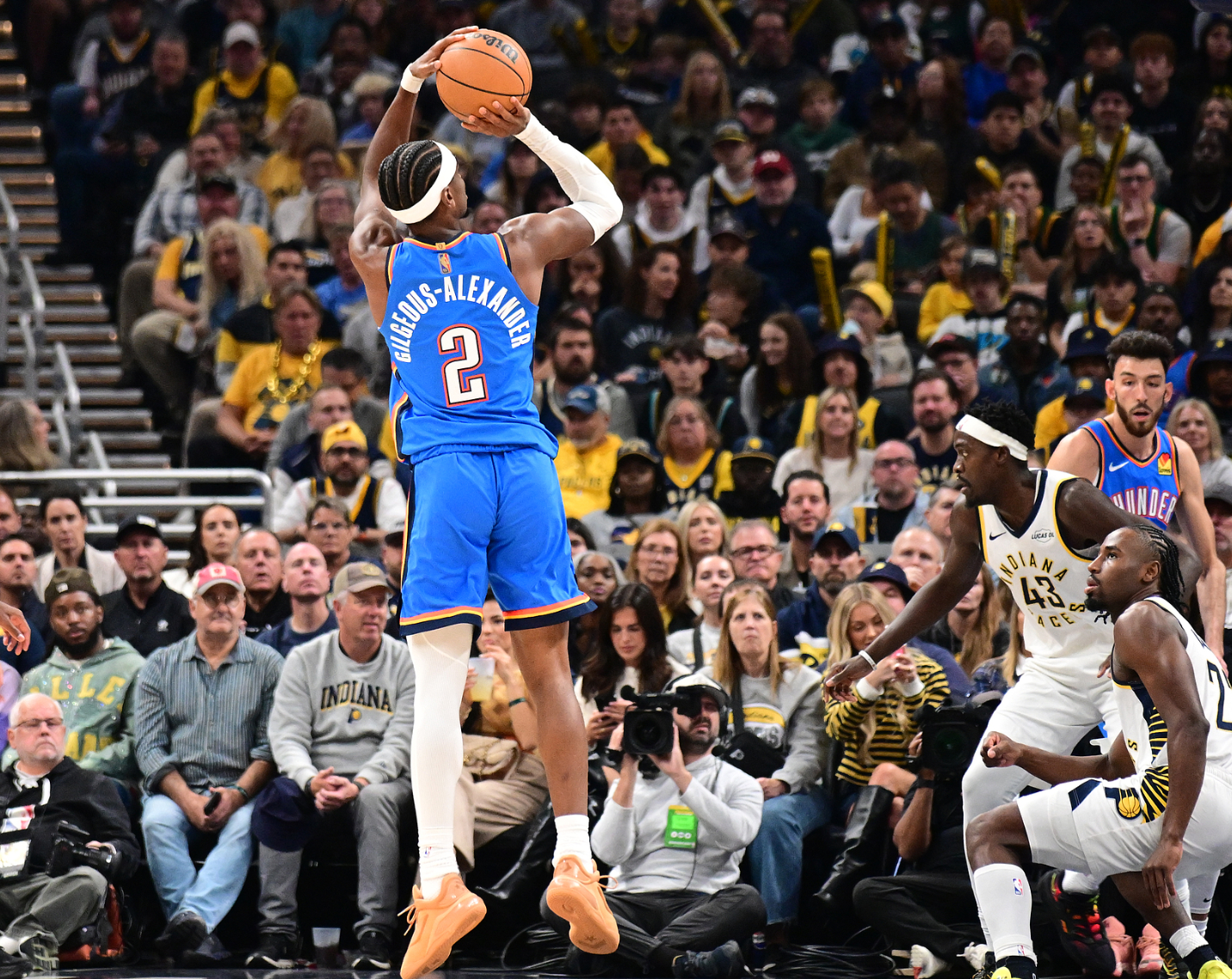 第三节亚历山大罚球减少,但9分钟内仍7投3中,三分3中1,罚球1中1,拿下8分2篮板。末节他命中关键三分达成30+,随后通过造犯规、中投和突破持续追分。尽管步行者西卡中投绝平,但加时赛中亚历山大连续造犯规,并在第二个加时赛造马瑟林第六犯,完成2+1后左手上篮打停对手。最终,威金斯的两记三分帮助雷霆锁定胜局。