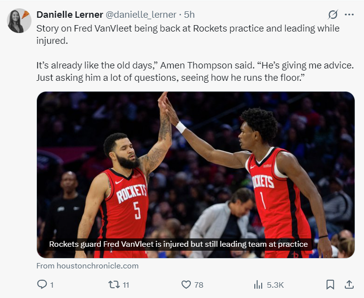 据火箭队记者Danielle Lerner透露,范弗利特已经成为了火箭队的队长。在训练中,他经常给年轻球员们提供建议,尤其是对出任火箭队先发一号位的阿门·汤普森,范弗利特希望帮助他成为一名真正的一号位球员。