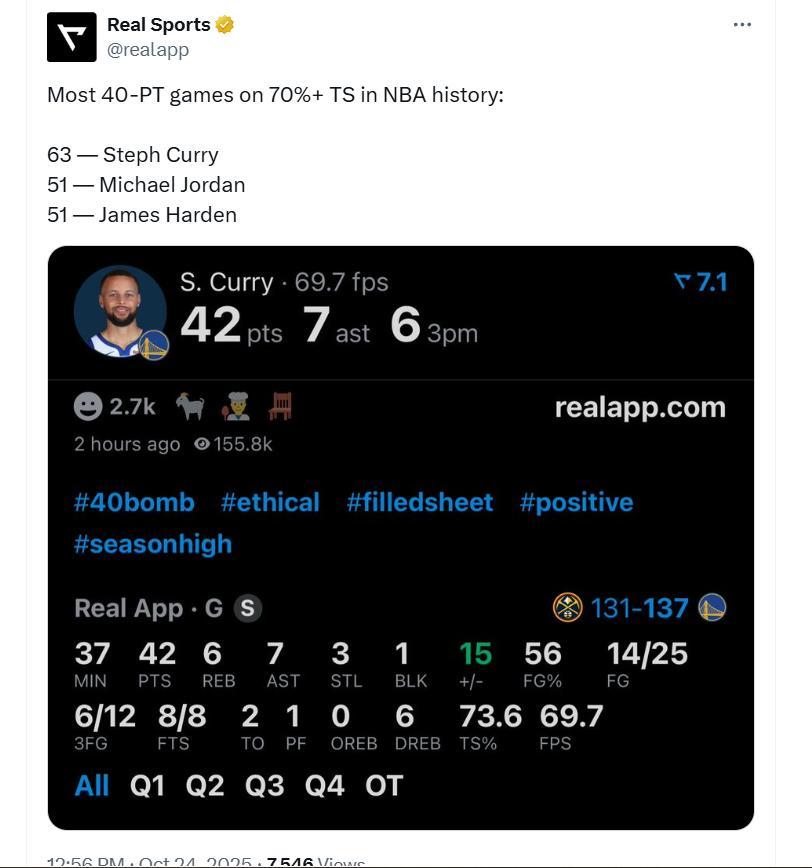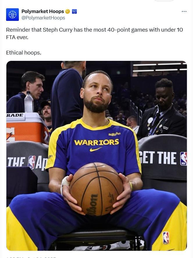 3、据美媒Polymarket Hoops的数据统计,历史上30岁之后的40+场次,乔丹44场领跑,库里42场高居第2。