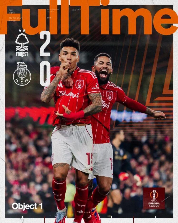 在欧联杯第三轮,诺丁汉森林和波尔图狭路相逢。这两支球队都曾拿过两个欧冠冠军,实力不容小觑。上半场19分钟,贝德纳雷克手球送点,吉布斯-怀特罚入。下半场森林再获点球,伊戈尔-热苏斯主罚一蹴而就。凭借两粒点球破门,森林主场以2-0战胜波尔图,赢得“欧冠德比”,也终结了各项赛事连续10场不胜的尴尬。