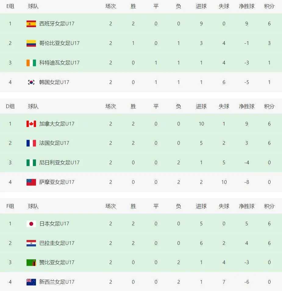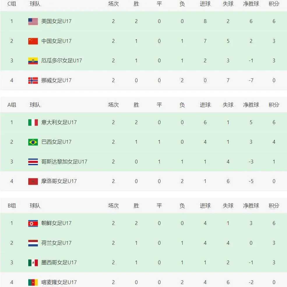 赛前传来重大利好消息:根据其他小组积分形势,D组和F组的第三、四名球队目前均积0分,即使末轮取胜最多只能获得3分。而这几支球队的净胜球普遍处于劣势(尼日利亚-4、萨摩亚-8、赞比亚-3、新西兰-6),与中国队当前+2的净胜球形成鲜明对比。这意味着中国队即使末轮0-1或0-2小负,仍可能凭借净胜球优势成为成绩最好的小组第三名晋级。