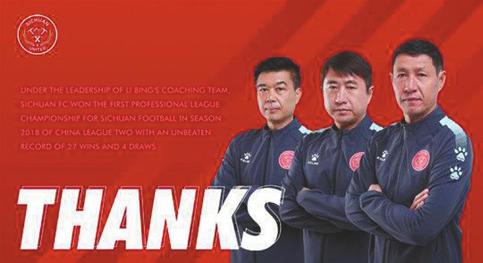 冯峰(左一)配合黎兵(右一)执教四川FC
