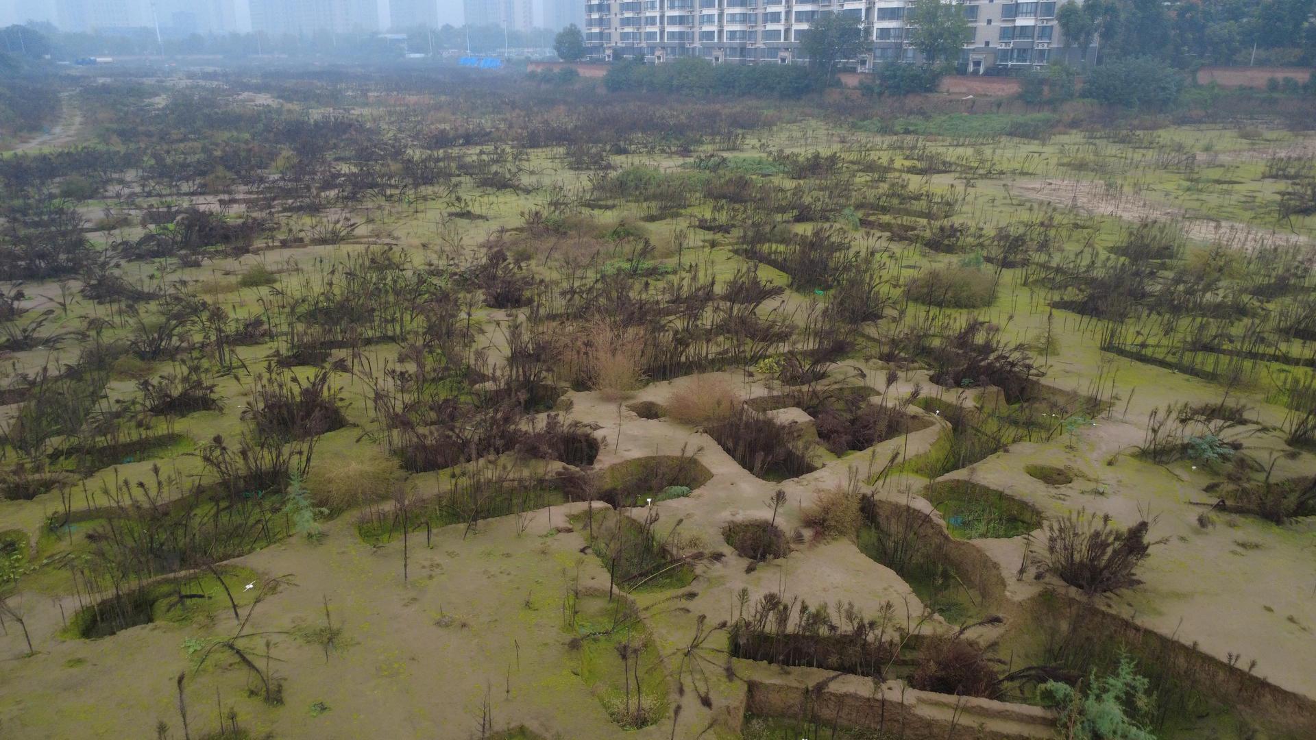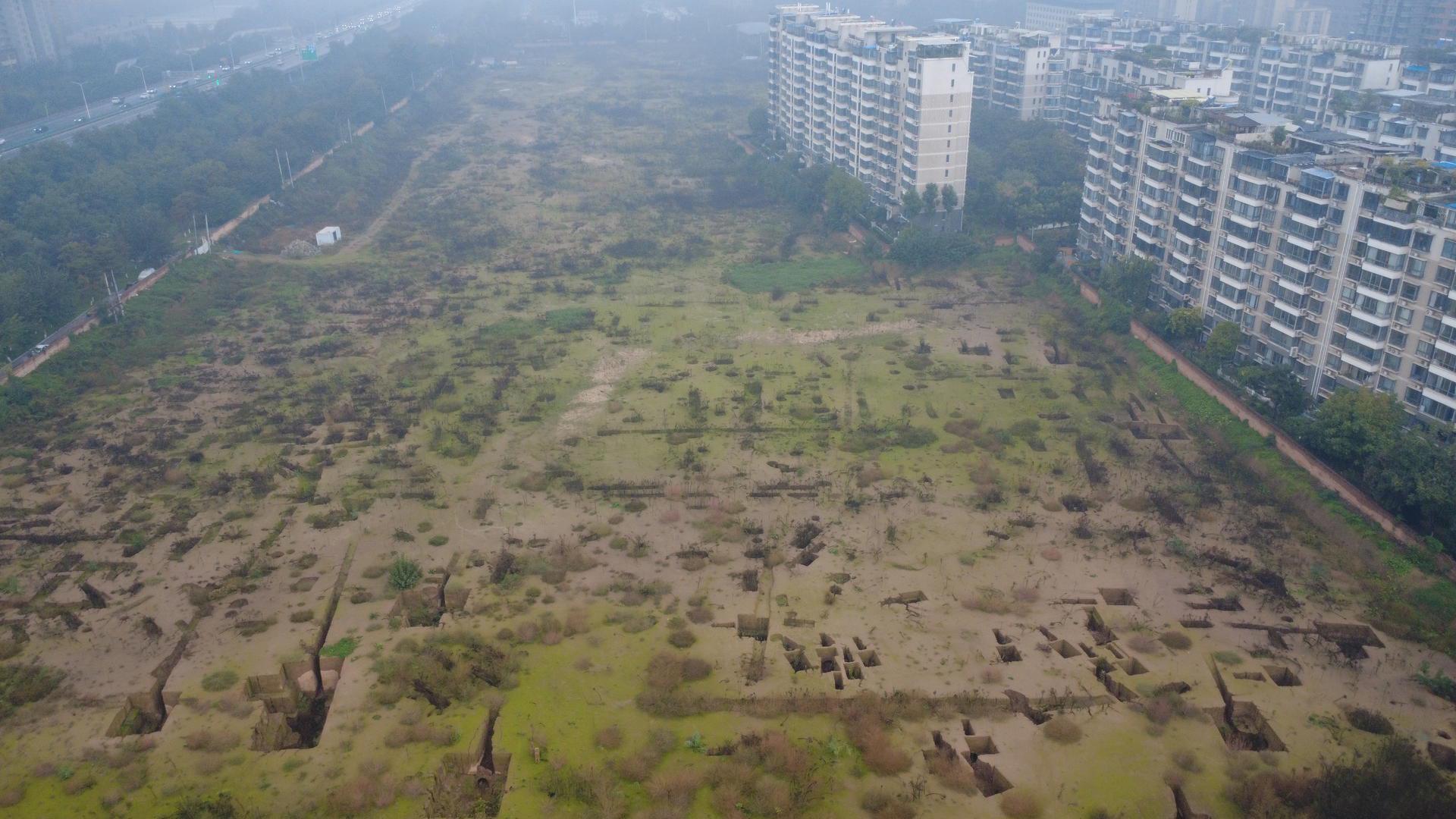 记者实地探访发现,该考古区域位于西安市南三环与东仪路交叉口附近,现场大门紧闭且无工作人员值守。通过航拍画面可见,整个区域地面几乎被青苔和稻草覆盖,部分考古坑洞内甚至长出灌木,形成独特的“生态景观”。