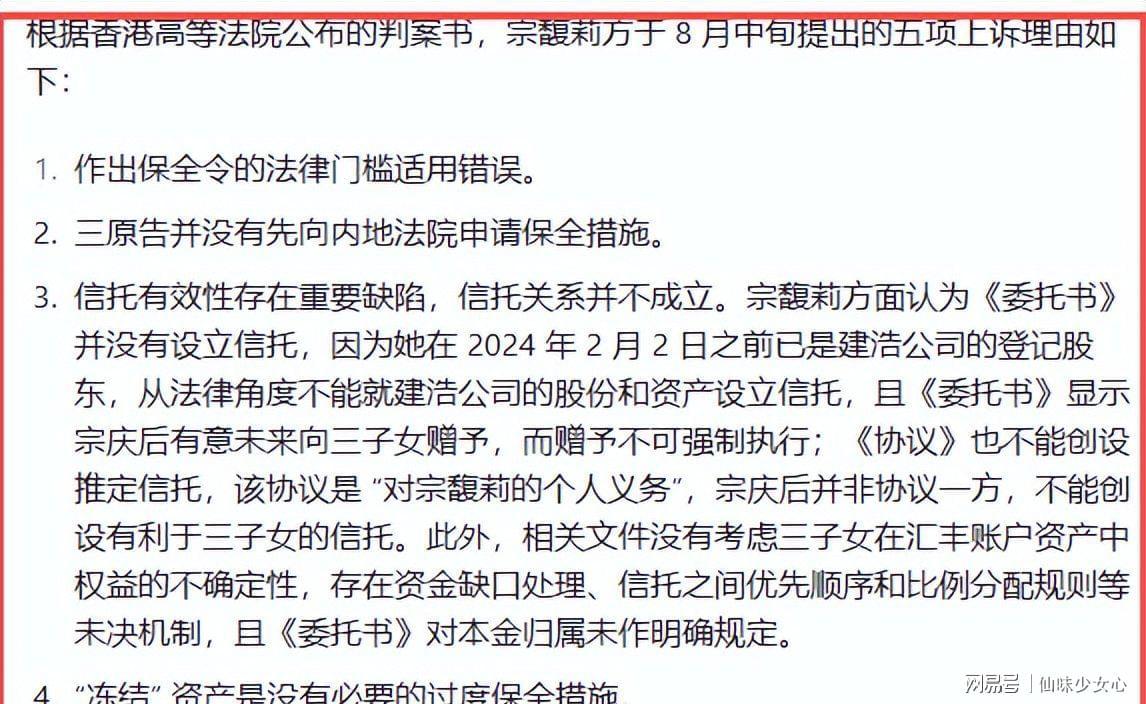 当时宗馥莉并不满意这个判决,于是在8月中旬,宗馥莉开始上诉,并明确提出了5个上诉理由。