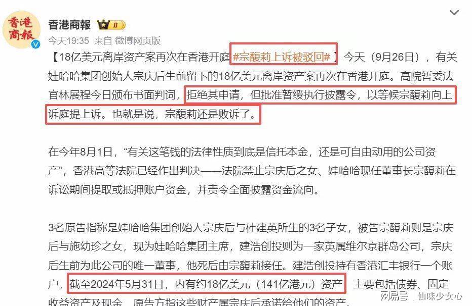 9月26日的这一天,香港高等法院关于宗馥莉及其关联公司的上诉申请作出了最终裁决: