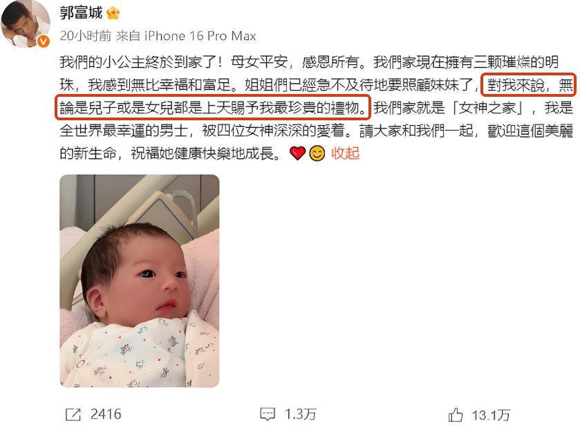 再度当爹的郭富城喜上眉梢,还在社媒上大方晒出了小公主的靓照,