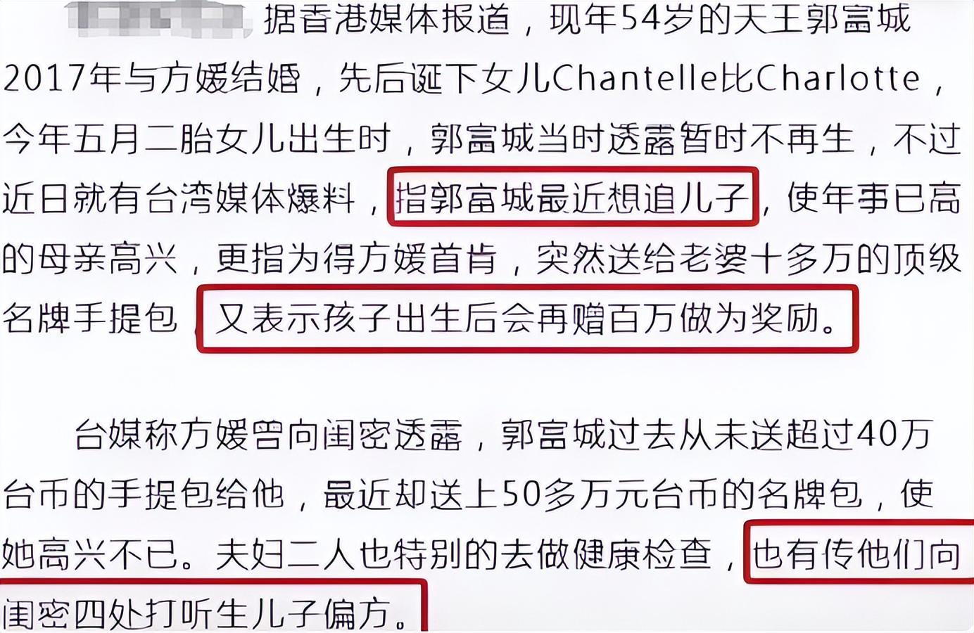 没过多久后方媛便宣布怀孕,种种一切似乎都在佐证郭富城想拼儿子的传闻。