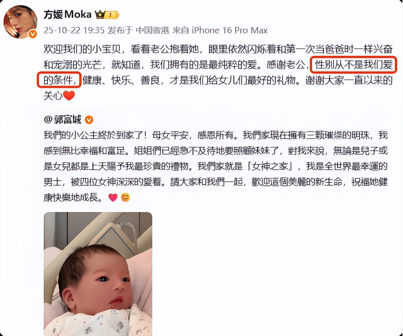 方媛在香港怀孕,郭富城应该早早就知道性别,足以见得是真心喜欢三胎女儿,