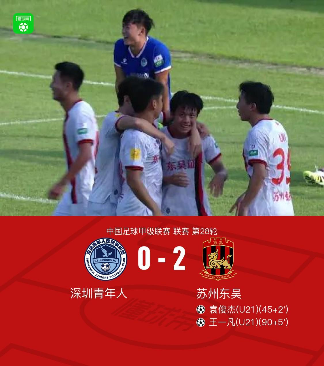 北京时间10月25日,2023赛季中国足球协会甲级联赛第28轮迎来一场焦点对决,深圳青年人坐镇主场迎战苏州东吴。本场比赛,苏州东吴凭借袁俊杰和王一凡的进球,以2-0的比分战胜对手,终结了此前连续三场不胜的尴尬纪录。