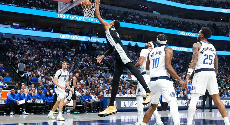 25-26赛季,注定是文班亚马的赛季。揭幕战做客独行侠主场,面对浓眉、莱夫利、加福德组成的联盟顶级内线群,他展现出了教科书般的降维打击能力。首节刚过半,他便连续三次在篮下强吃得手,其中一记隔着莱夫利的单手劈扣,直接将对手扣退两步。第三节,他更是上演了攻防一体的名场面:先是结结实实地封盖了莱夫利的上篮,随即快攻中面对同一防守者,潇洒完成后撤步三分+加罚,直接将分差拉开到20分以上。当他在第四节扛着浓眉完成暴力隔扣时,独行侠主场竟响起了零星的“MVP”呼声,客场倒戈的奇观,足以印证其表现的震撼力。