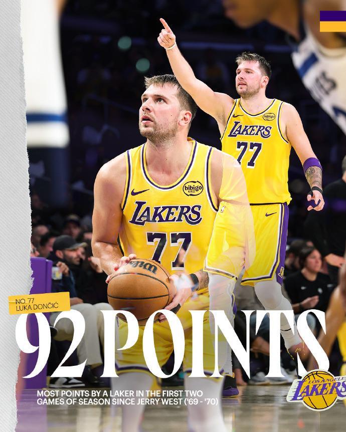 在本赛季前两场比赛中,东契奇一共拿下92分(43分+49分),仅次于张伯伦(2次,一次106分,一次105分)和安东尼-戴维斯(95分)。东契奇场均贡献46分11.5篮板8.5助攻1抢断,成为新赛季最耀眼的球星之一。