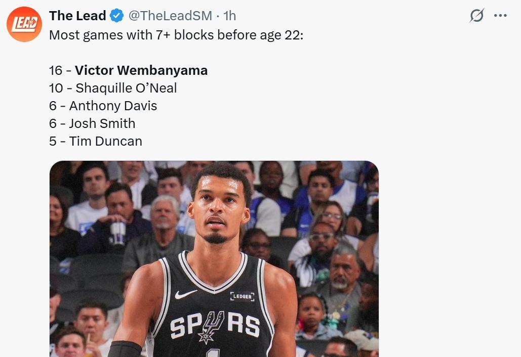 凭借这样的表现,文班亚马继续刷新NBA历史纪录,他已经16次单场至少送出7次封盖,刷新了22岁以前球员在该表现上的历史最佳纪录。排在他身后的球员分别是奥尼尔(10次)、浓眉哥(6次)、约什史密斯(6次)和邓肯(5次)。