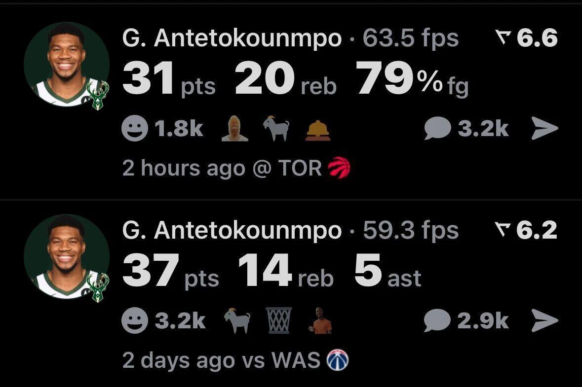 从数据层面看,雄鹿队的补强效果立竿见影。新援与原有阵容的化学反应超出预期,但真正引爆联盟热议的,仍是字母哥的统治级发挥。在职业生涯第13个赛季,他延续了欧洲赛场归来的强势状态,成为继科比、詹姆斯之后,猛龙队又一位「超巨检测器」。