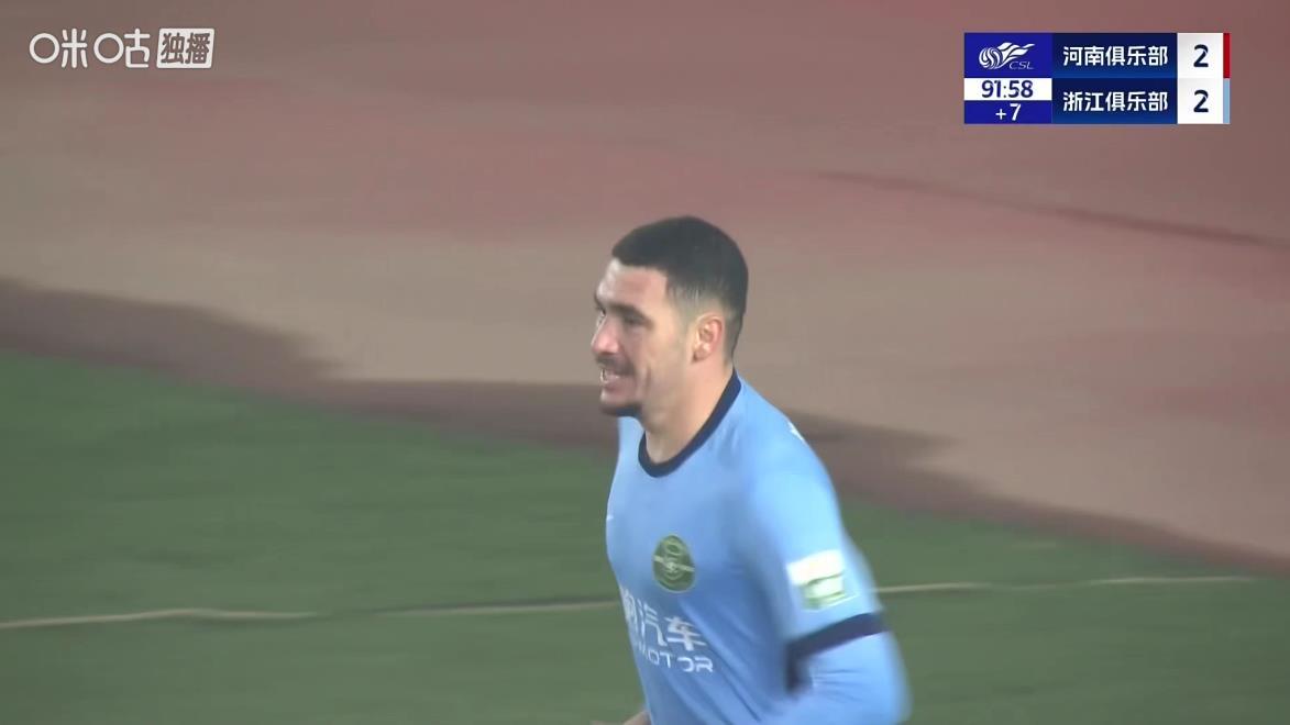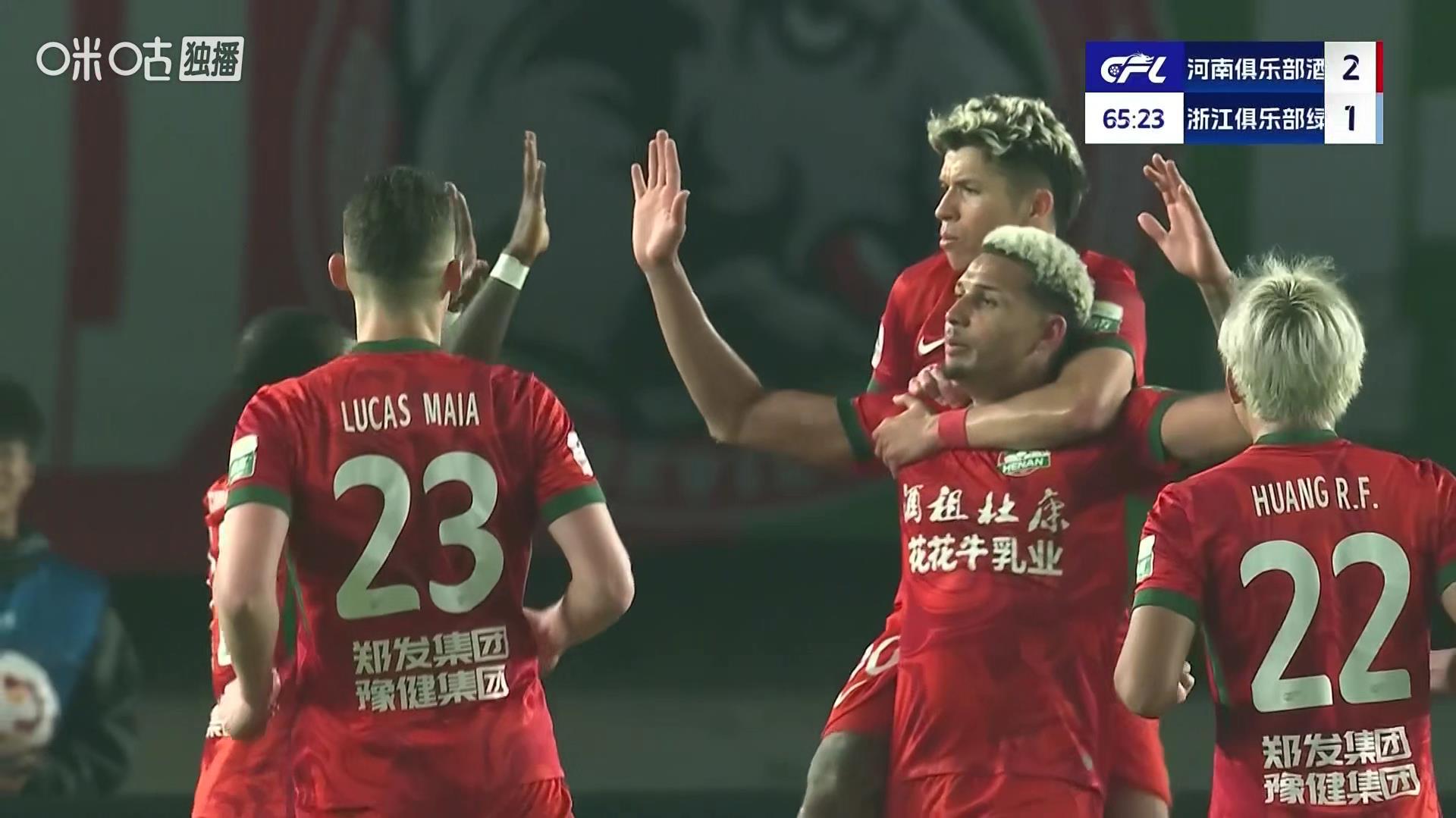 另一场比赛中,河南队坐镇主场迎战浙江队。上半场第18分钟,河南队反击中卡多索的射门被扑出后反弹入网,河南队1-0领先。下半场第52分钟,卡多索错失必进球,浙江队随后由卡列洛扳平比分。第62分钟,李提香禁区拉倒卡多索,卡多索点球命中帮助河南队再度领先。补时阶段,卡列洛攻入绝平球,最终两队2-2握手言和,浙江队遭遇4连平。
