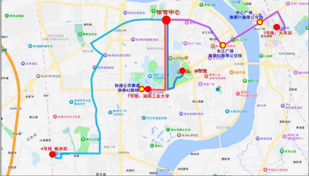为方便球迷前往赛场,赛前2小时将有4条常规公交线路提供免费乘坐服务,发车间隔为5~10分钟/趟。4个起始点分别为湖南工业大学站(快速公交廊道)、神农城(森林路)、株洲火车站东广场、株洲西站。