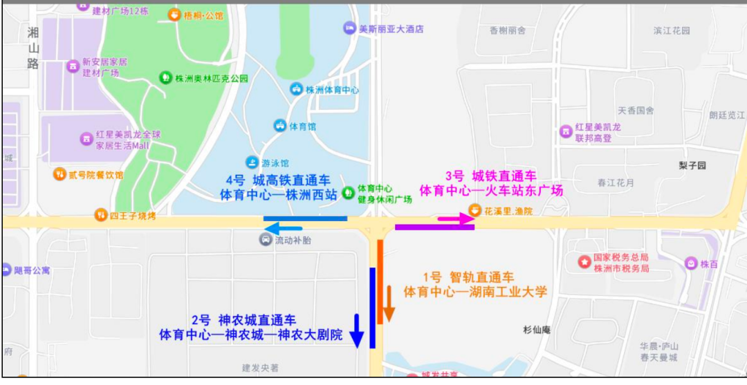 除了免费接驳车辆外,还有4条常规公交线路途经株洲市体育中心,供球迷朋友们选择: