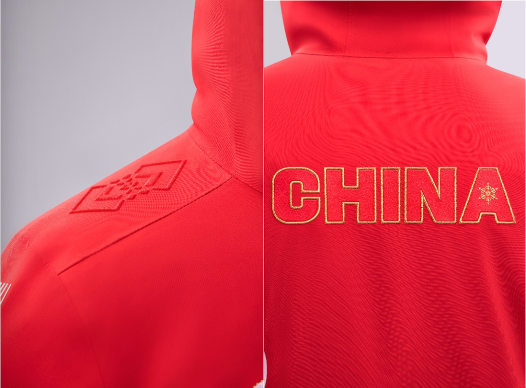 领奖服在细节处理上同样匠心独运,肩部、袖口等部位采用了传统吉祥寓意纹样——“双胜纹”。这一纹样由两个菱形交叠穿插而成,寓意着胜利与祥瑞,并在此基础上衍生出“双胜雪花纹”,为领奖服增添了独特的文化魅力。此外,领奖服背后的CHINA字母纹饰在夜晚光照后依然清晰可见,彰显了中国体育代表团的国际身份与自豪感。