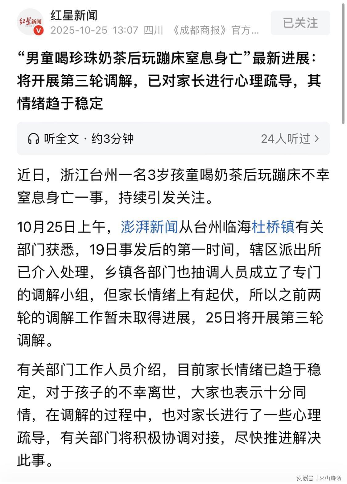 据媒体25日报道,近日,浙江台州发生一起令人痛心的悲剧:一名3岁孩童在喝完珍珠奶茶后,在蹦床上玩耍时突然窒息,经抢救无效不幸身亡。此事迅速引发社会广泛关注和讨论。