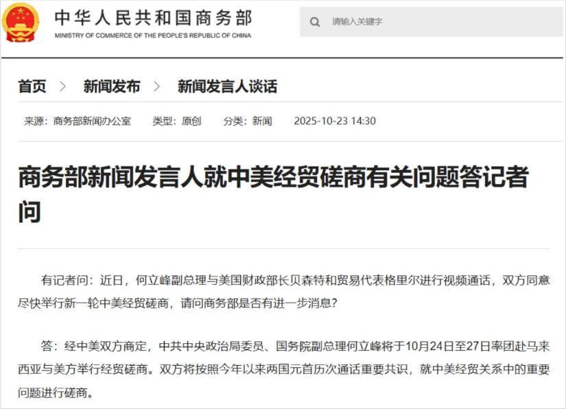 据中国商务部官网10月23日发布的最新消息,商务部新闻发言人在答记者问时表示,中国将率团赴马来西亚与美方就经贸关系中的重要问题进行磋商。这一消息在中国股票市场收盘前半小时发布,随即引发市场强烈反应,上证指数由跌转涨,大幅拉升。