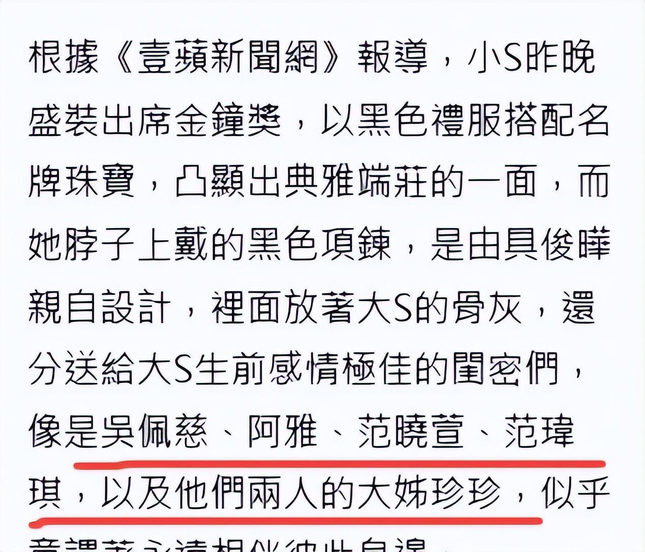 除了小S脖子上那条,他还分别送给了吴佩慈、阿雅、范晓萱等大S生前好友。