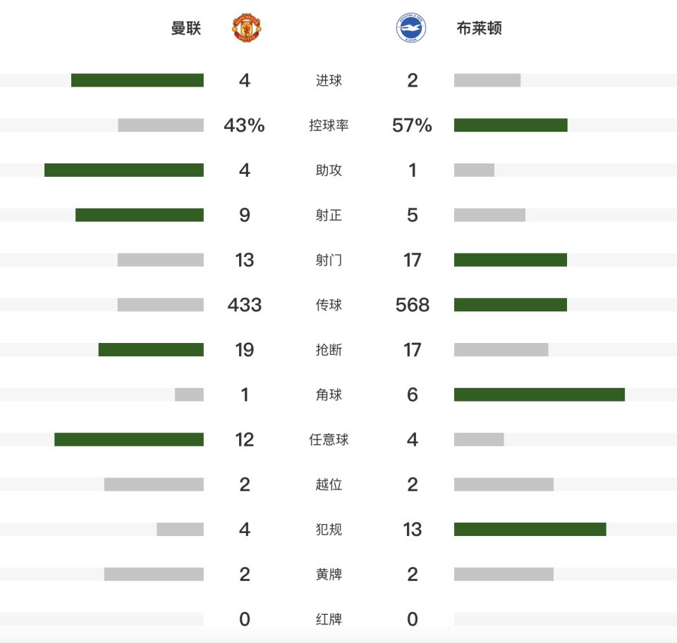 英超:曼联4-2布莱顿3连胜!库尼亚首球姆伯莫双响,胖虎传射建功