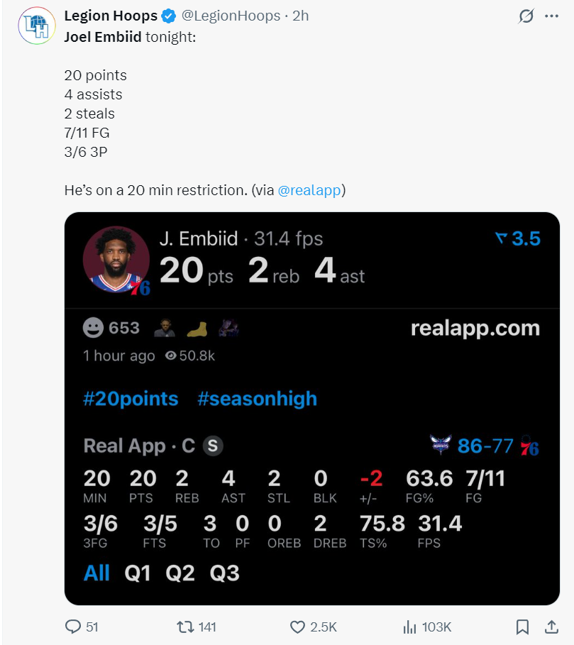 实际上,恩比德在季前赛的收官战中就登场了,但那场比赛他同样受到严格的登场时间限制,仅仅打了19分钟。目前,费城76人队给他的限制就是20分钟以内。