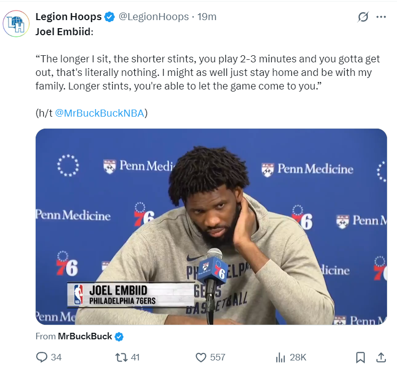 赛后,恩比德对自己的登场时间限制表达了极度不满。他无奈地表示:“我在板凳席坐着的时间比登场的时间还多,我登场2 - 3分钟就得被换下来,这怎么玩?我还不如待在家里陪家里人呢!只有上场时间足够,才能让自己逐渐适应比赛的节奏。”他还进一步说道:“如果我上半场登场时间足够长,那么就意味着这场比赛要结束了,我下半场就无法登场。我希望自己能早点迈过这个坎儿,我会继续努力的,我每一天都会证明自己。”