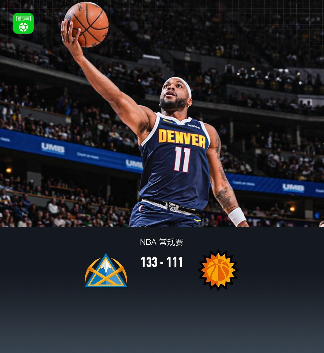 末节决战,掘金没有给太阳任何机会。贾马尔-穆雷再得7分,最终掘金以133-111锁定胜局,送给太阳一场惨痛的失利。