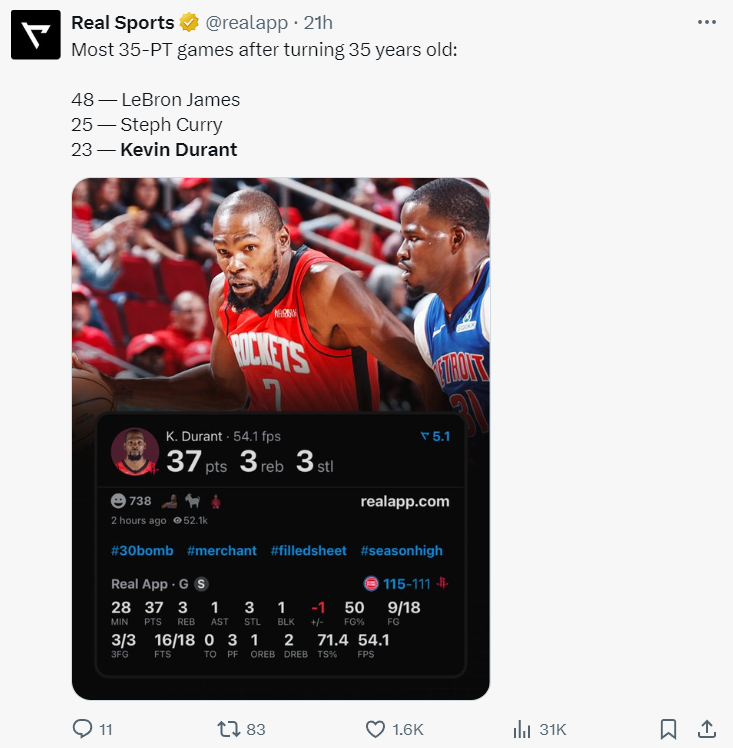 值得一提的是,杜兰特在35岁以上年龄已经拿到了23次30+的得分,这一数据在历史上排名第三,仅次于詹姆斯和库里。而在这场比赛中,他仅仅出战了28分钟,效率之高令人惊叹。