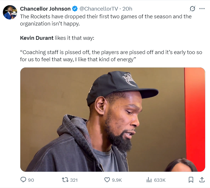 然而,尽管杜兰特个人表现如此出色,火箭队却依然遭遇了二连败。赛后,杜兰特在接受采访时明显流露出不悦的情绪。他表示:“我投丢了9个球,我真的觉得我可以连中18个球,这让我很难受。教练组和球员们都很恼火,但这一波二连败或许对这支球队来说是一个变好的信号。目前才开赛,大家都渴求胜利,我喜欢这种氛围。”