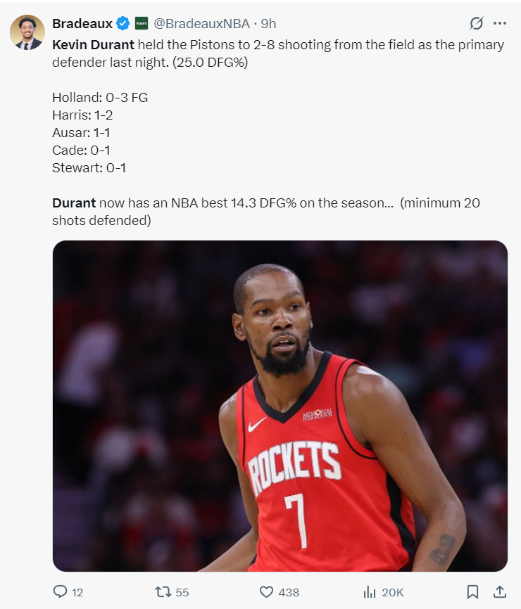 37岁的杜兰特在防守端同样表现出色。面对活塞队的进攻,他作为防守者时,霍兰德3中0、哈里斯2中1、奥萨尔1中1、CC1中0、斯图尔特1中0,他的防守回合转化率高达14.3%,已经是联盟最顶级的防守者之一。