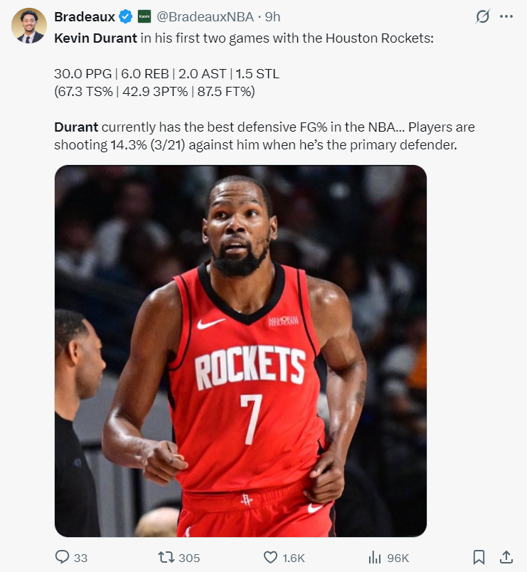 在火箭队这两场比赛中,杜兰特场均贡献30分6篮板2助攻1.5抢断,真实命中率高达67.3%,三分命中率42.9%,罚球命中率87.5%。他作为防守者时,对手合计21中3,如此出色的攻防表现却依然无法帮助火箭队赢得比赛,这无疑让人感到惋惜。