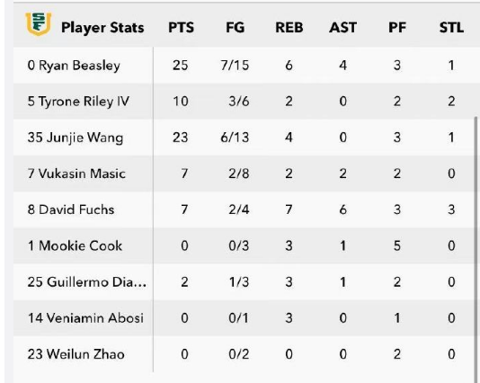相比之下,赵维伦的表现则显得有些黯淡。他仅替补登场了3分27秒,两次外线三分出手均未命中,得分、篮板、助攻、抢断和盖帽五项数据均为0。
