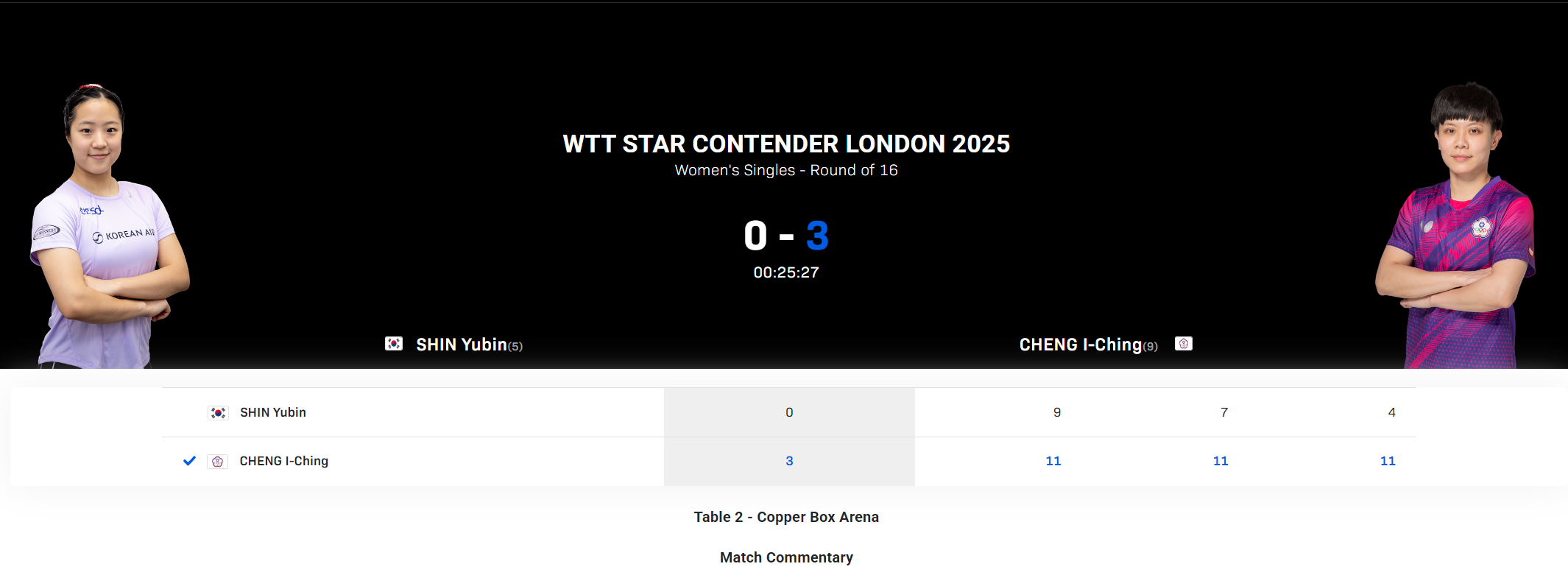 北京时间10月25日,WTT伦敦球星挑战赛女单1/8决赛上,一场备受瞩目的对决展开。世界排名第13的韩国选手申裕斌,与世界排名第16的中国台北老将郑怡静狭路相逢。最终,郑怡静以3-0的绝对优势横扫申裕斌,三局比分分别为11-9、11-7、11-4,申裕斌因此止步16强。