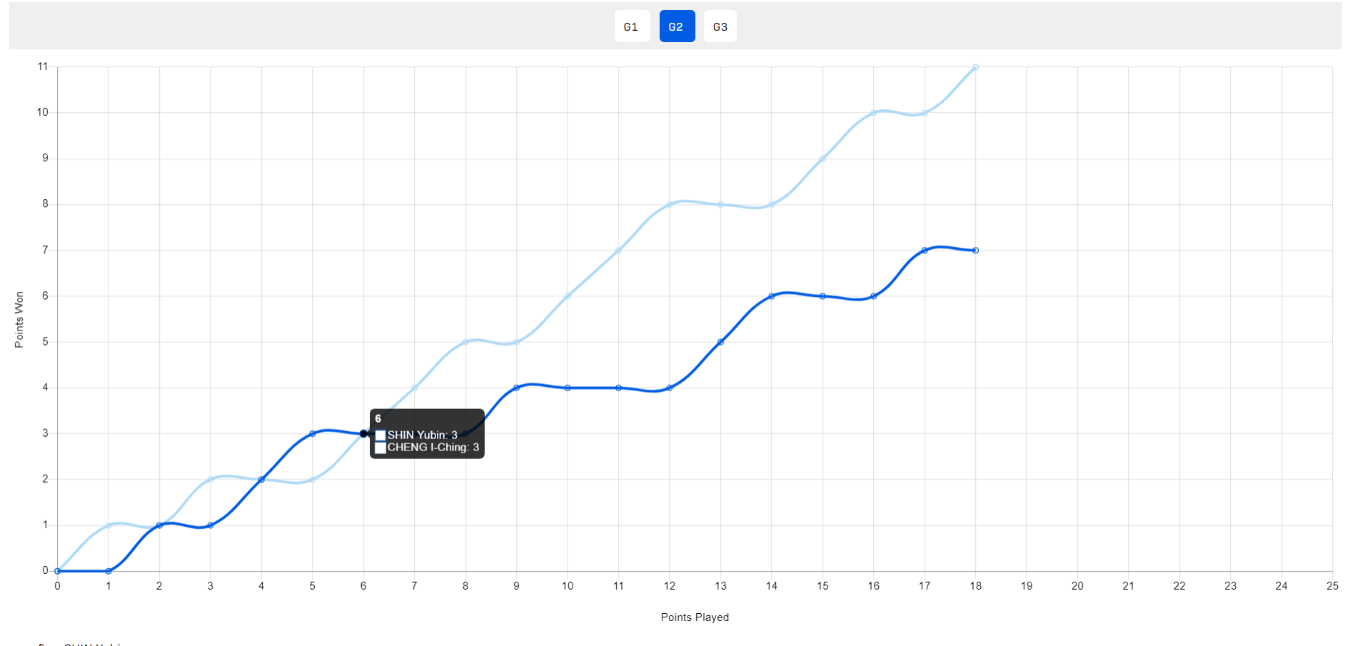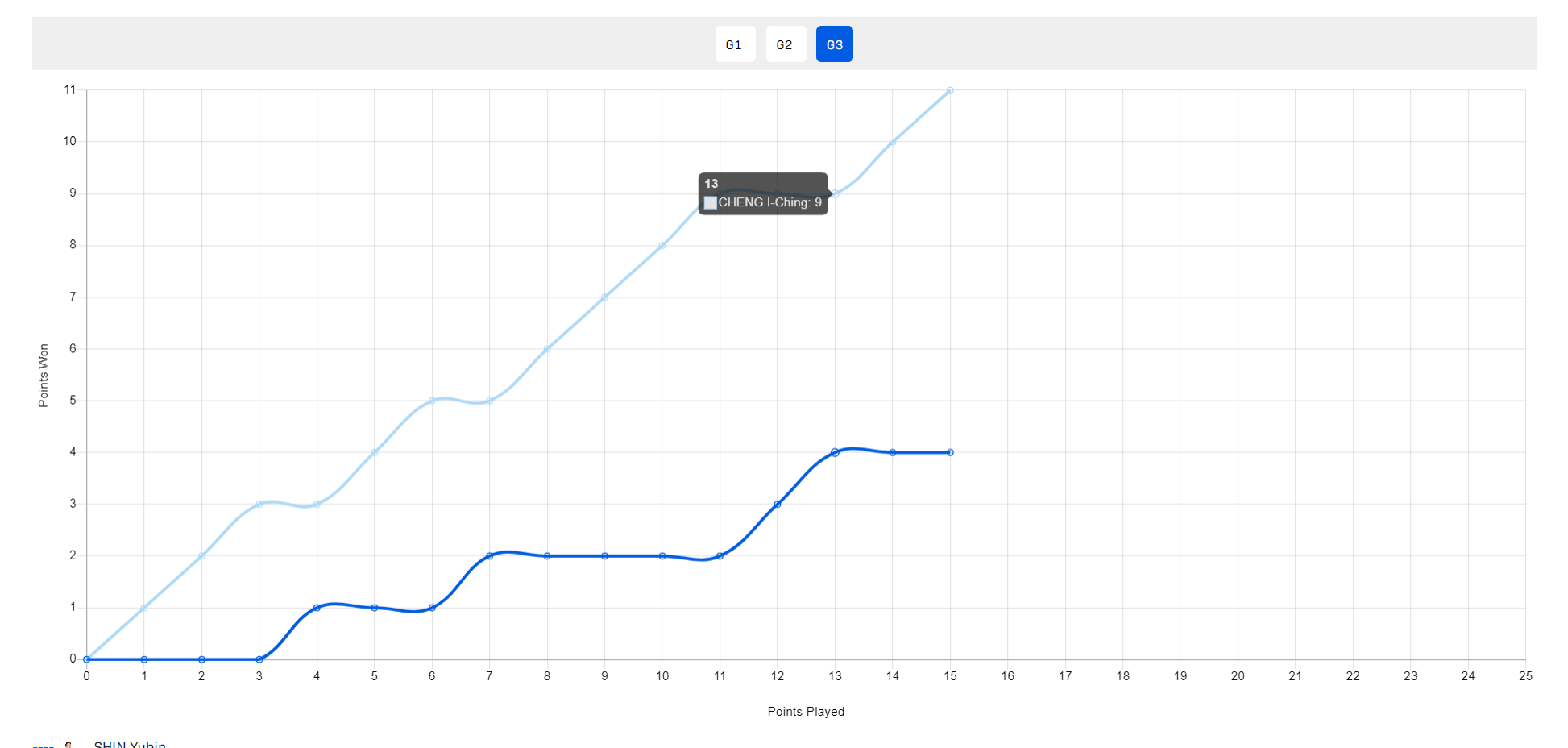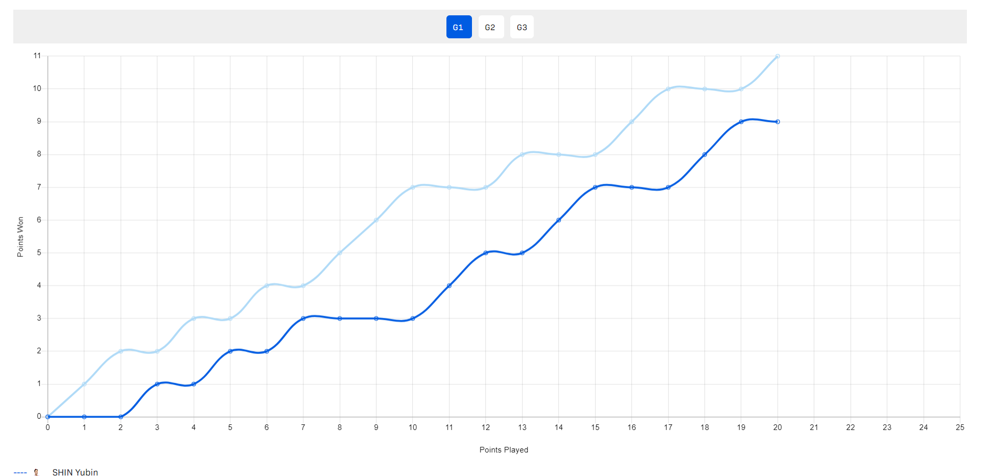 第二局比赛,两人从1-1打到3-3后,申裕斌突然崩盘,以一波1-5的劣势落后到4分。此后,她再也没有展现出追分的势头,最终以7-11结束比赛。