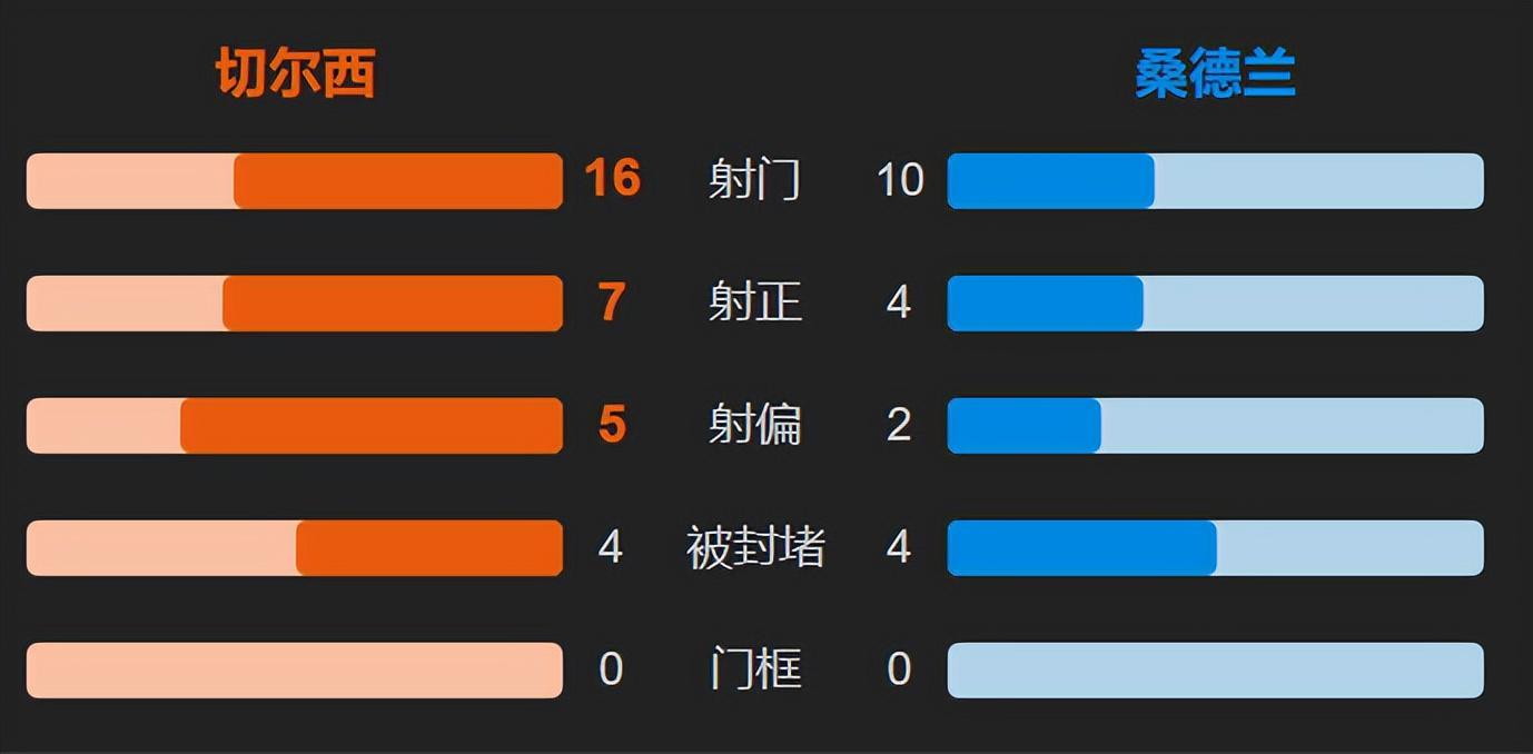 在恩佐和凯塞多双重首发的情况下,切尔西的中场体系本应相当完备,这也是他们能够与桑德兰的扎卡、萨迪基、特劳雷、勒费等人抗衡的基础。然而,在实际比赛中,切尔西在制造机会的数量、前场抢劫的次数以及由此带来的得分机会上,虽然占据了数据优势(如控球率达到69%,而桑德兰只有31%),但在绝对机会的把握上却与对手相差无几。