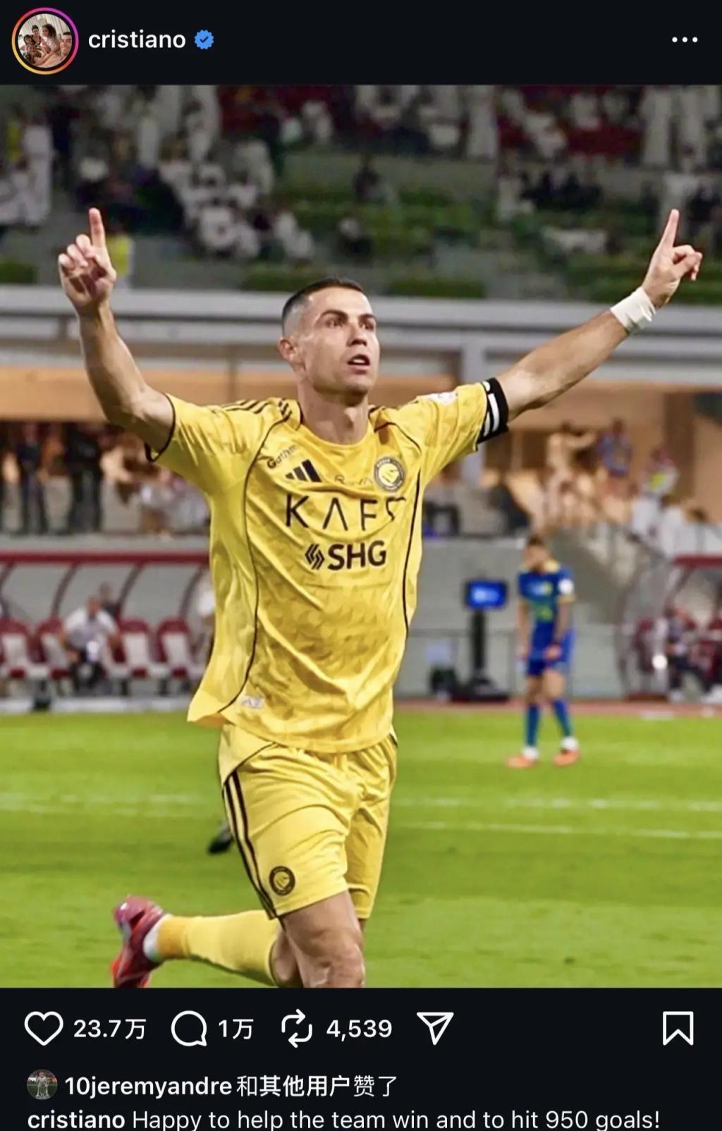 C罗打入职业生涯第950球,率队领跑沙特联赛。