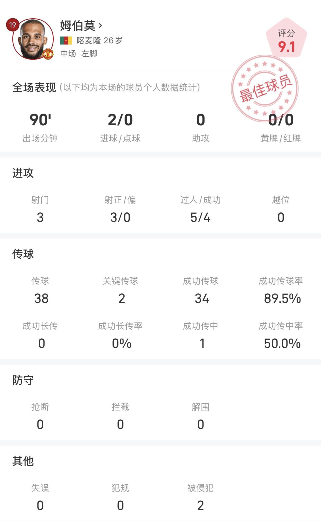 在传球方面,姆伯莫同样表现出色。他全场共传球38次,其中34次成功到位,传球成功率高达89.5%。此外,他还贡献了2次关键传球,为队友创造了得分良机。