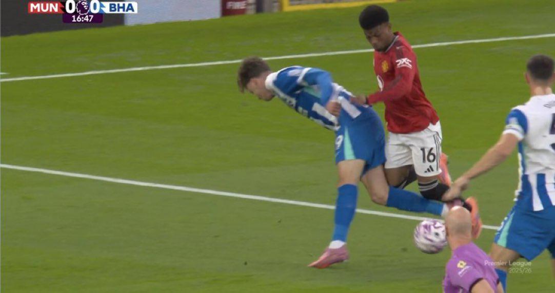 当时,曼联球员阿马德抓住机会,迅速突入布莱顿的禁区内。然而,就在他准备进一步处理球时,被布莱顿的防守球员德库耶佩从身后放倒。这一动作十分明显,阿马德重重地倒在了禁区内,现场曼联球迷纷纷高呼要求裁判判罚点球。